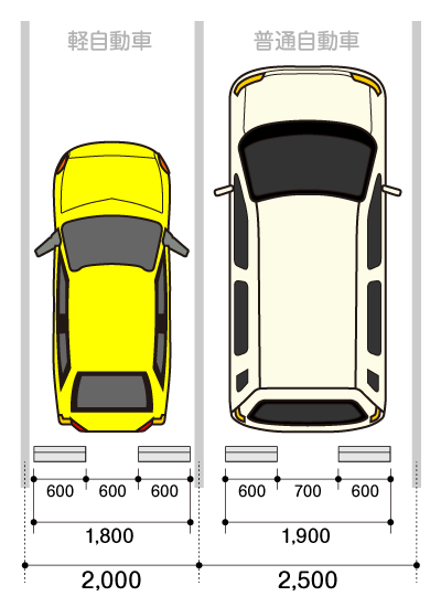 車止めと車止めの間隔は、軽自動車専用の駐車スペースであれば60cm間隔、それ以外の普通車用のスペースで70cm間隔というのが標準的な設置間隔になります。