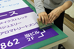 デザインが印刷されたシートを、看板素材(AG板)に貼り込みます。板とシートが傾いてズレてしまったり、空気が入って見苦しい仕上がりとならないよう、プロの腕の見せ所です。