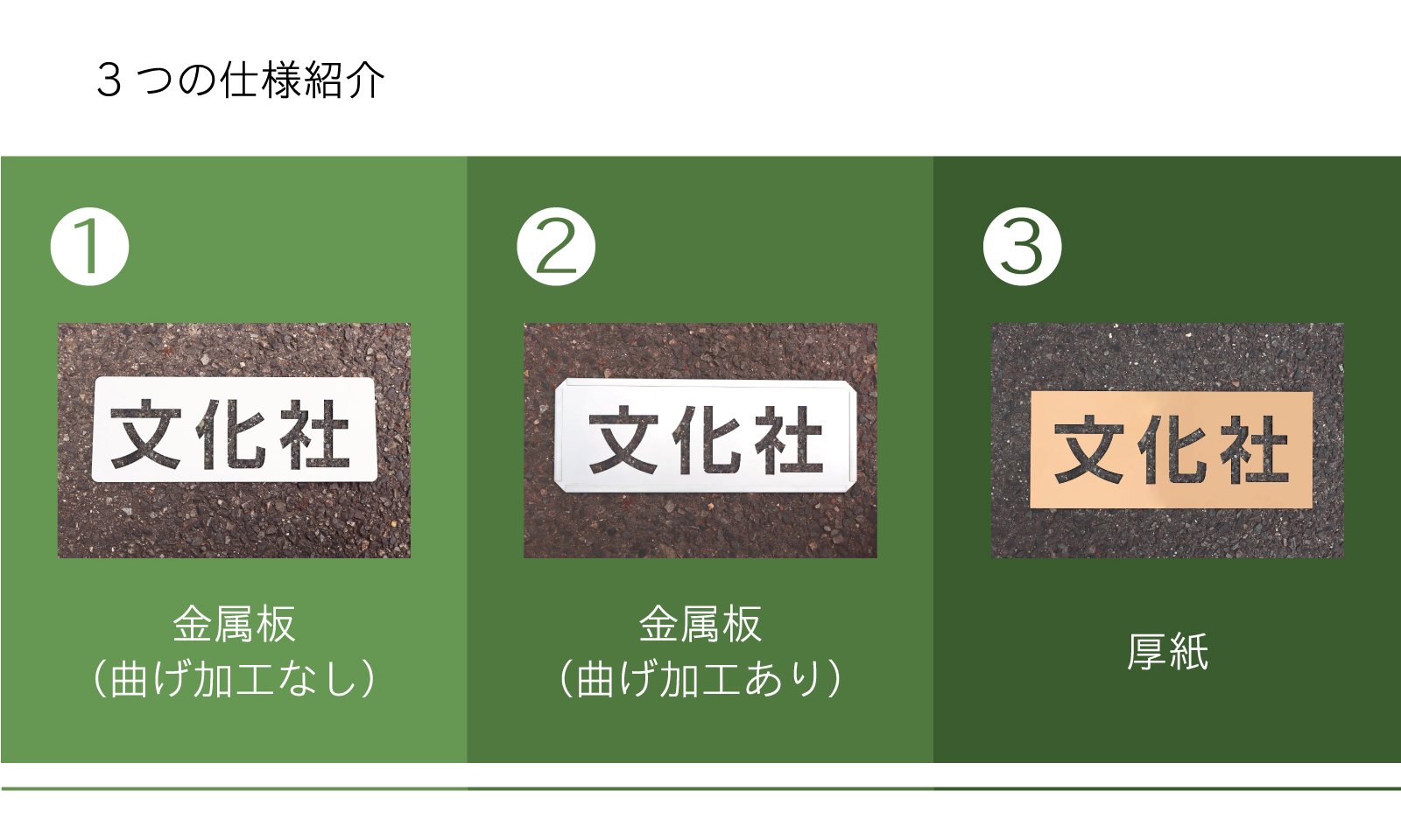 | プレートの素材 | 金属:亜鉛メッキ鋼板(曲げ加工あり) 厚み1mm 金属:亜鉛メッキ鋼板(曲げ加工無し) 厚み1mm 角丸加工 厚紙:クラフトボール紙 厚み約0.7mm |