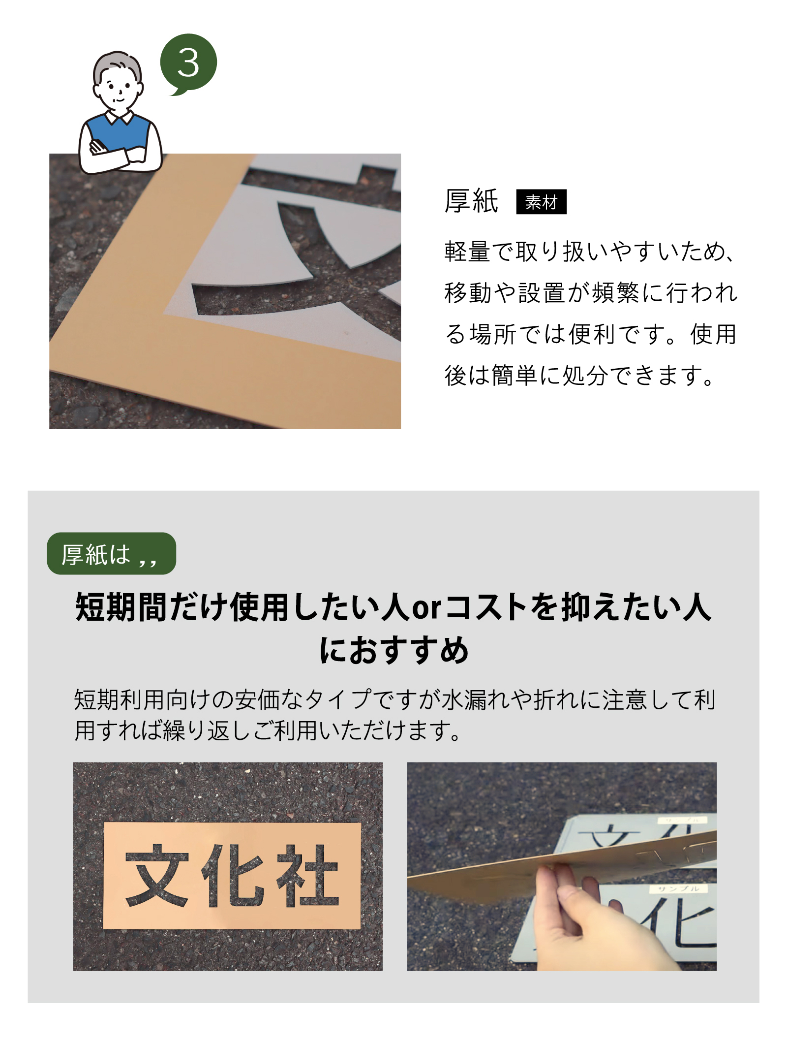 アスファルトやコンクリートにスプレーで文字を吹き付けるためのプレート(型枠)を特注にて製作します。無料でお見積りいたしますので、ご希望の内容を下記フォームからお知らせください。