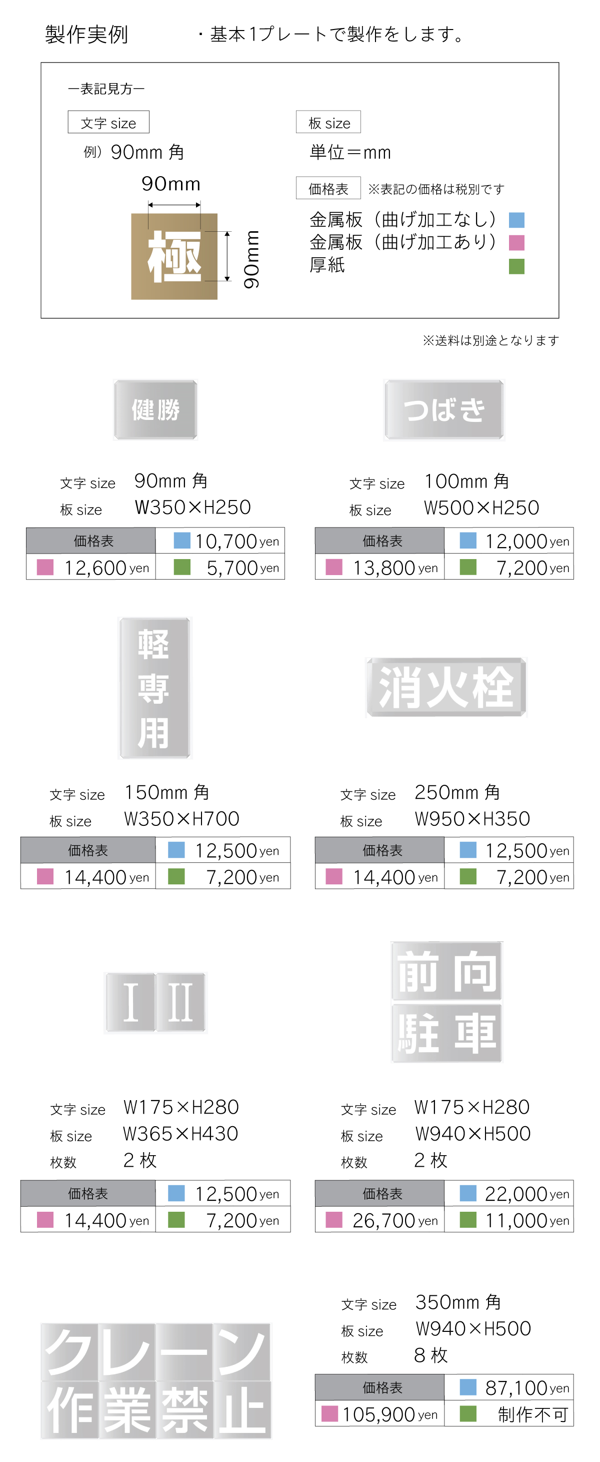 ・プレートのサイズは文字より一回り大きくなります。 ・画数の多い文字は製作できない場合があります。 ★下記の対応も可能です。ご希望の場合にはお知らせください。 ・書体[標準] 角ゴシック →→→ 他の書体も承ります ・文字加工[標準] 全ての文字を1枚のプレートに収める →→→ 1文字1枚のプレートで製作可能 →→→ 文字数が多い場合には複数行でも製作可能 |